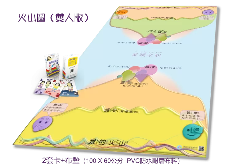 2025新推出「火山圖雙人版」,乃針對小學到高中生,在教師、家長或促進者引導下對話,以善意溝通處理衝突。在一張大布墊上有兩座對立火山,中間交界是「無錯天空」。兩座象徵內在世界的火山,比喻衝突時浮現的情緒與未被滿足的需要。在大人引導覺察自己想法與客觀觀察的差別、先自我同理自己並表達真正在意什麼?相互傾聽他人,使原本封閉的「火山」透過對話冷卻,最後能共創合作的請求,修復關係。非常適合在校園及家庭中使用。 全套含2副卡牌,一副48張卡( 感受卡28張,需要卡17張,請求卡2張,作者簡介1張)及1張地墊。 【購買】:歡迎點這裡,到瑪利亞基金會網頁購買