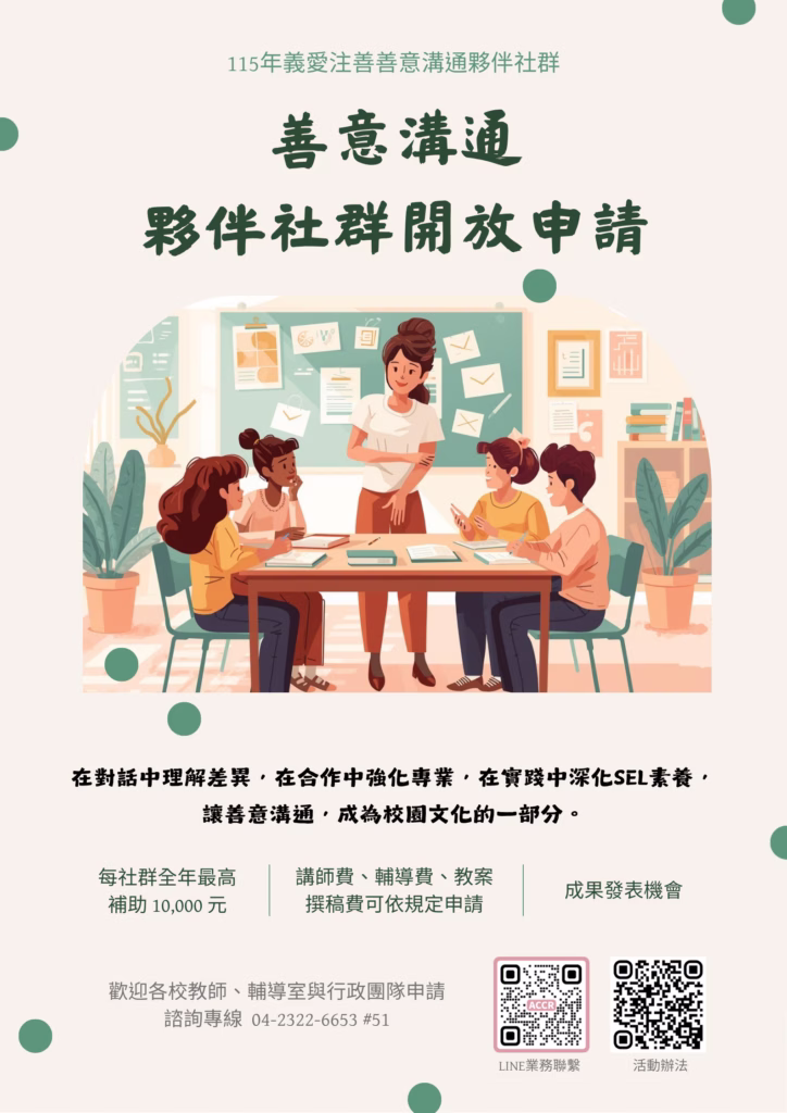 115年度「義愛注善」善意溝通夥伴社群專案現已正式開放申請。誠摯邀請曾經同行的夥伴再次加入,也歡迎更多關心教育現場的學校與老師一同參與,讓善意在校園扎根、在課堂發芽,成為支持孩子面對世界的重要能力。